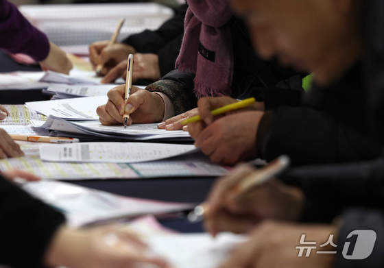 10일 오후 서울 마포구청에서 열린 노인일자리 박람회에서 어르신들이 노인공익활동 및 역량활용사업 신청서를 작성하고 있다. 2025.12.10/뉴스1 News…