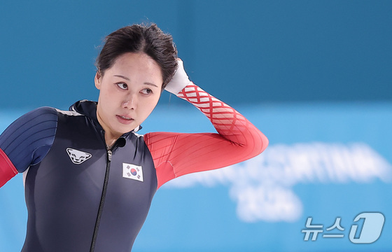 스피드스케이팅 박지우가 20일현지시간 이탈리아 밀라노 스피드스케이팅 스타디움에서 열린 스피드 스케이팅 여자 1500m에서 레이스를 마친 후 기록을 확인…