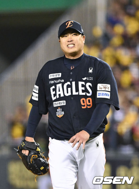 [OSEN=잠실, 이상학 기자] 프로야구 한화 이글스 투수 류현진(38)가 19년 만의 한국시리즈에서 5실점 빅이닝을 허용하며 4점 리드를 지키지 못했다. 류현진은 27일 서울 잠
