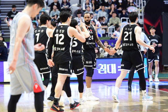 [OSEN=우충원 기자] 수원 KT가 6강 플레이오프 진출에 실패했지만 홈에서 현대모비스를 꺾었다. 수원 KT는 5일 서수원칠보체육관에서 열린 2025-2026 LG전자 프로농구