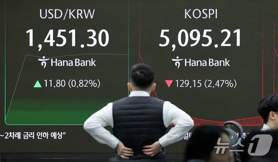 코스피가 하락 출발한 2일 서울 중구 하나은행 본점 딜링룸 전광판에 장초반 시황이 나타나고 있다. 2026.2.2/뉴스1 News1 박지혜 기자개인 …