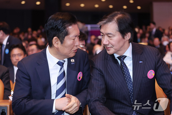 정청래 더불어민주당 대표왼쪽와 조국 조국혁신당 대표가 지난 3월 1일 서울 강남구 코엑스에서 열린 제107주년 3·1절 기념식에서 대화를 나누고 있다…