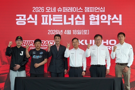 금호타이어 G.마케팅담당 윤민석 상무왼쪽 4번째와 슈퍼레이스 마석호 대표왼쪽 3번째를 비롯한 양측 주요 관계자들이 후원 조인식을 실시…