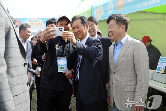 일 제주 제주시 애월읍 봉성리 새별오름 일원에서 열린 ' 제주 도새기 축제'를 방문한 정청래 더불어민주당 대표. 이 자리에는 오영훈 제주도지사, 김한규·문대림…