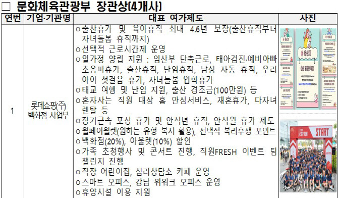 [이데일리 김미경 기자] ㈜롯데백화점을 비롯해 종로구시설관리공단, ㈜토마스, (사)한국발전인재개발원 등 4개사가 우수 여가친화경영 기업·기관으로 선정돼 문화체육관광부 장관상을 받는
