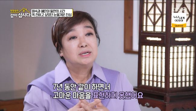 [OSEN=장우영 기자] 가수 혜은이가 배우 박원숙에게 고마운 마음을 전했다. 22일 방송된 KBS2 ‘박원숙의 같이 삽시다’에서는 7년의 함께 살이를 마치는 박원숙과 혜은이, 홍
