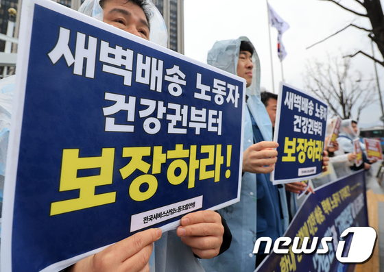 년 월 일 전국서비스산업노동조합연맹 조합원들이 서울 종로구 정부종합청사 앞에서 기자회견을 열고 정부의 새벽배송 확대 정책 중단과 노동자들의 건강권과 고용안…