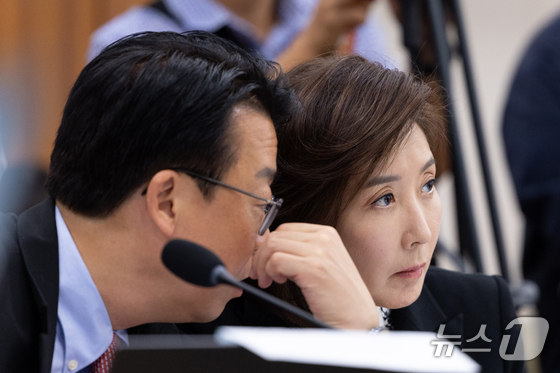 지난달 일 서울 여의도 국회에서 열린 제회국회정기회 법제사법위원회 제차 전체회의에서 나경원, 곽규택 국민의힘 의원들이 대화하고 있다. …