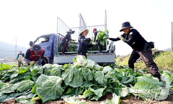 전남 해남군 북평면 앞 배추밭에서 농민들이 외국인 노동자들과 배추 수확을 하고 있다. News1 김태성 기자고용노동부와 법무부가 외국인 계절노동자를 …