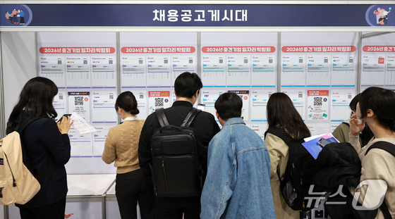 지난 3월 서울 서초구 aT센터에서 열린 '2026년 중견기업 일자리박람회'를 찾은 구직자들이 채용공고게시대를 살펴보고 있다. 2026.3.31 뉴스1 이호…
