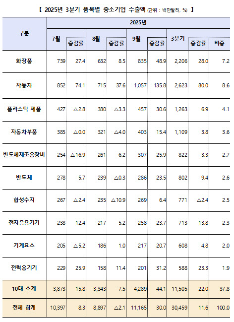 [이데일리 김영환 기자] 중소기업 수출의 ‘간판 품목’이 화장품에서 자동차로 교체됐다. 26일 중소벤처기업부가 발표한 ‘2025년 3분기 중소기업 수출 동향’에 따르면 중소기업 수