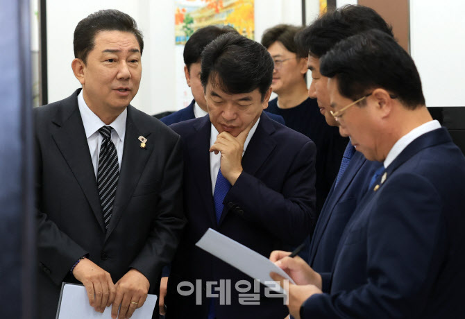 김병기(사진 왼쪽) 더불어민주당 원내대표와 문진석 원내운영수석부대표 등이 19일 국회에서 열린 국정감사 및 현안 관련 기자간담회를 마친 후 대화하고 있다. (사진=노진환 기자) [