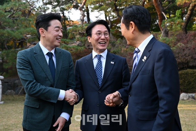 김민석 국무총리(가운데)와 정청래 더불어민주당 대표(오른쪽), 강훈식 강훈식 대통령비서실장이 9일 서울 종로구 총리 공관에서 열린 고위당정협의회에서 인사를 나누고 있다. (사진=방