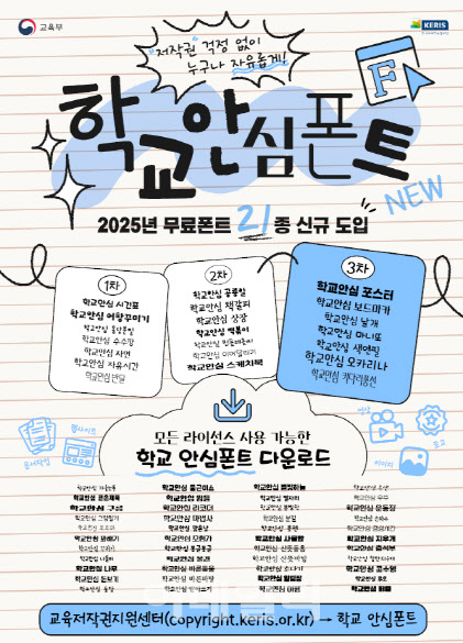 [이데일리 신하영 기자] 교육부가 저작권 걱정 없이 사용할 수 있는 한글 폰트(워드프로세서의 글자체)를 무료로 보급한다. 교육부와 한국교육학술정보원은 ‘학교 안심 폰트’ 21종을
