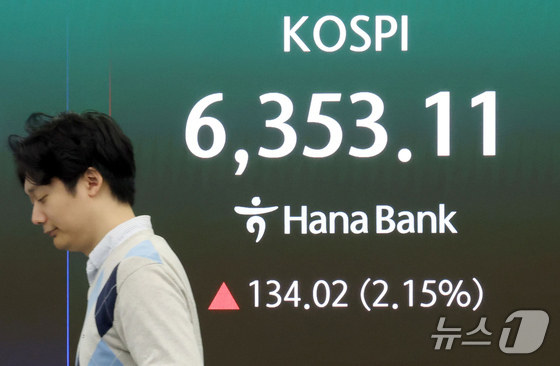 코스피가 장중 사상 최고치를 경신한 21일 오전 서울 중구 하나은행 본점 딜링룸 현황판에 전장대비 134.02포인트2.15% 상승한 6,353.11을 …