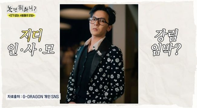 [OSEN=연휘선 기자] 빅뱅의 지드래곤이 '놀면 뭐하니?'에 강림할까. '인사모' 프로젝트가 GD 등장의 기대감을 심었다. 지난 8일 저녁 방송된 MBC 예능 프로그램 '놀면 뭐
