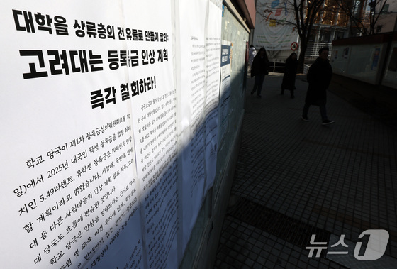 지난해 1월 서울 고려대 안암캠퍼스에 등록금 인상을 반대하는 대자보가 붙었다. 2025.1.17/뉴스1 News1 이동해 기자사립대학 등록금 동결을 …