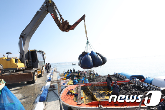 26일 전남 신안군 압해읍 앞바다 지주식 김양식장에서 어민들이 채취한 물김이 위판을 끝내고 운반하고 있다. 2024.1.26/뉴스1 News1 김태성 기자…