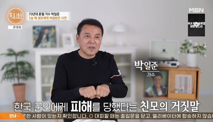 (MHN 박선하 기자) 가수 박일준이 안타까운 출생의 비밀을 고백했다. 15일 방송된 MBN '특종세상'에는 1970년대 팝 발라드 황제로 불렸던 박일준이 등장했다. 1세대 다문화