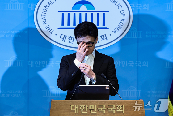 한동훈 국민의힘 전 대표가 14일 서울 여의도 국회 소통관에서 윤리위의 제명 결정에 대한 입장을 밝히기 전 안경을 고쳐쓰고 있다. 2026.1.14/뉴스1 …