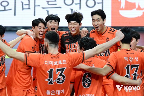 OK저축은행 선수들. KOVO 제공남자 프로배구 OK저축은행이 선두 대한항공의 연승 행진에 제동을 걸었다.OK저축은 12일 부산 강서실내체육관에…