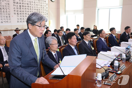 나경원 국민의힘 의원의 남편인 김재호 춘천지방법원장오른쪽이 일 서울 여의도 국회 법제사법위원회에서 열린 서울고법·서울중앙지법 등에 대한 국정감사에서…