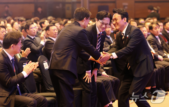 김민석 국무총리가 4일 오전 서울 강남구 코엑스에서 열린 제62회 무역의 날 기념식에서 축사를 마친 후 윤진식 무역협회장과 악수하고 있다. 2025.12.4/뉴스1 &c…