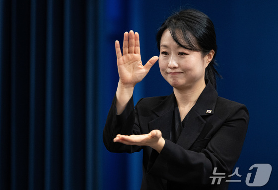 박지연 수어통역사가 10일 청와대 춘추관에서 김남준 대변인의 브리핑 발언을 수어통역하고 있다. 2026.2.10 뉴스1 이재명 기자"청와대에 수어통역…