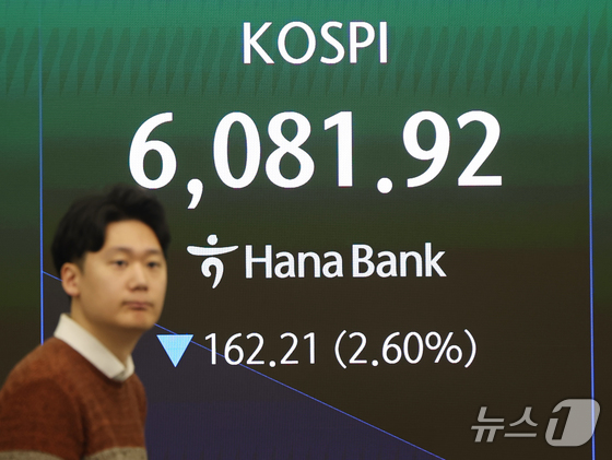 미국이 이란 공습 후 처음으로 장이 열린 3일 오전 서울 중구 하나은행 본점 딜링룸 전광판에 코스피 지수가 나오고 있다. 이날 코스피는 전 거래일보다 78.98포인트…