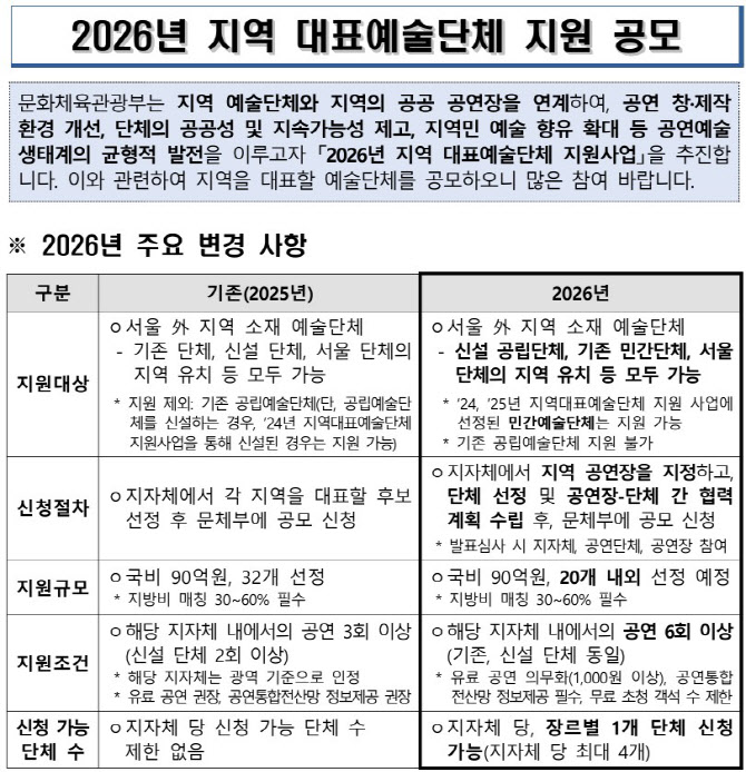 [이데일리 김미경 기자] 문화체육관광부는 ‘2026년 지역 대표 예술단체 지원사업’에 참여할 광역·기초지방자치단체(서울 제외)를 오는 12월 5일까지 공모한다고 25일 밝혔다. 문