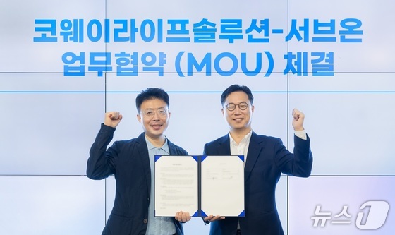 지난 일 서울 구로구 지타워 코웨이라이프솔루션 본사에서 열린 협약식에서 김명곤 코웨이라이프솔루션 대표왼쪽와 홍영준 서브온 대표가 기념 촬영을 하고 …