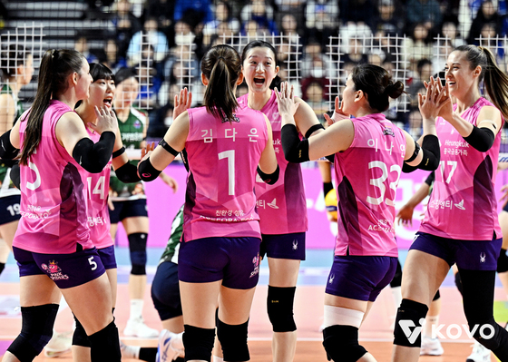 기뻐하는 흥국생명 선수들. KOVO 제공여자프로배구 흥국생명이 IBK기업은행을 제물로 시즌 첫 3연승을 달렸다.흥국생명은 24일 인천 삼산월드체…