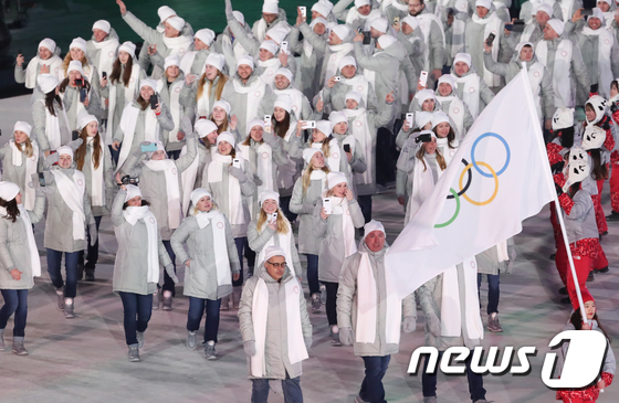 2018 평창동계올림픽 개막식에서 러시아 출신 선수들이 입장하고 있는 모습. 2018.2.9 뉴스1 허경 기자러시아가 12년 만에 패럴림픽 무대에서 …