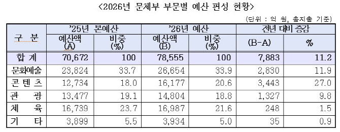 [이데일리 김미경 기자] 문화체육관광부 내년 예산이 7조8555억원으로 최종 확정됐다고 3일 밝혔다. 이는 올해 본예산 대비 7883억원(11.2%)이 증가한 규모다. 문체부는 이