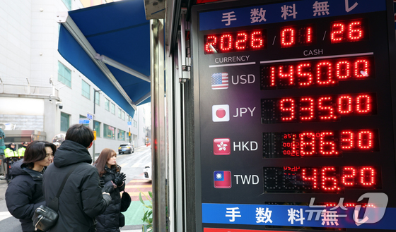 서울 명동에서 외국인 관광객들이 환전을 하고 있다. /뉴스1 News1우리은행은 27일 "트럼프 관세 리스크가 재부상했다"며 달러·원 환율아 1440…
