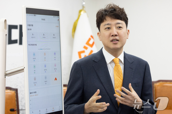 이준석 개혁신당 대표가 9일 서울 여의도 국회에서 열린 'AI 선거 사무장' 앱 시연회에서 앱을 소개하고 있다. 2026.3.9 뉴스1 이승배 기자…