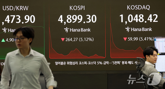 6일 오전 서울 중구 하나은행 딜링룸 전광판에 코스피 지수가 4900선 하회로, 코스닥 지수가 1100선 아래로 보이고 있다. 이날 코스피는 장초반 매도 사이드카가 발동…