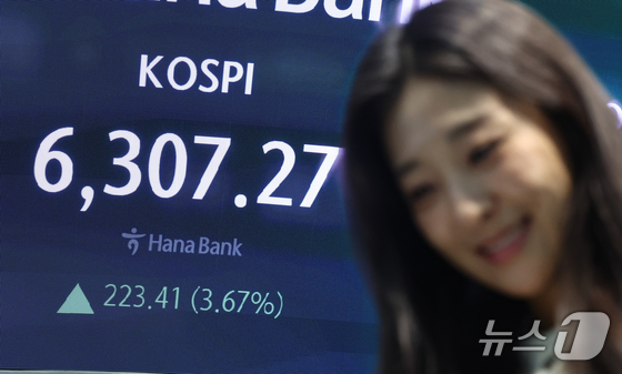 26일 서울 중구 하나은행 본점 딜링룸 전광판에 종가가 표시되고 있다. 이날 코스피는 전 거래일 대비 223.41포인트3.67% 오른 6307.27, …
