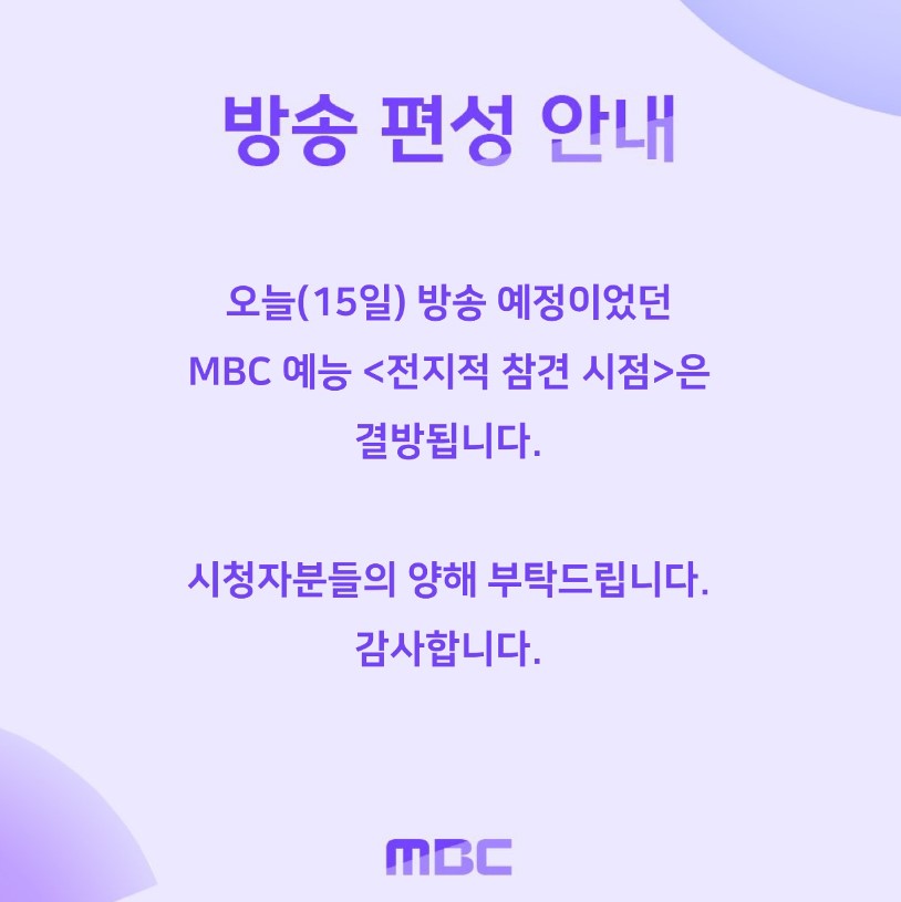 MBC 예능 프로그램 ‘전지적 참견 시점’이 오늘(15일) 결방됐다. 15일 밤 변경된 MBC 편성표에 따르면 ‘K베이스볼 시리즈 대한민국:일본 1차전’ 중계 여파로 인해 ‘전지적