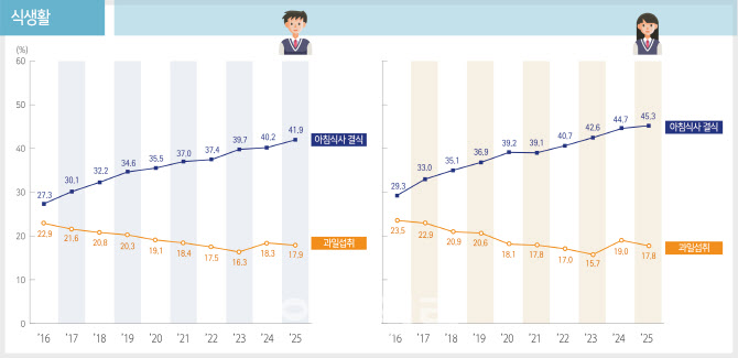 [이데일리 안치영 기자] 청소년 10명 중 4명은 아침 식사를 거르고 있는 것으로 나타났다. 아침결식 청소년이 지속 증가하면서 전문가들은 비만 등 대사증후군과 우울증, 학업장애 등