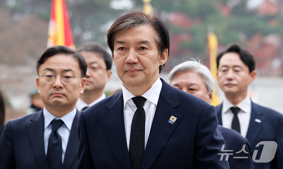 조국 조국혁신당 대표가 24일 서울 동작구 국립서울현충원에서 현충탑 참배를 마친 뒤 이동하고 있다. 2025.11.24/뉴스1 News1 박지혜 기자…