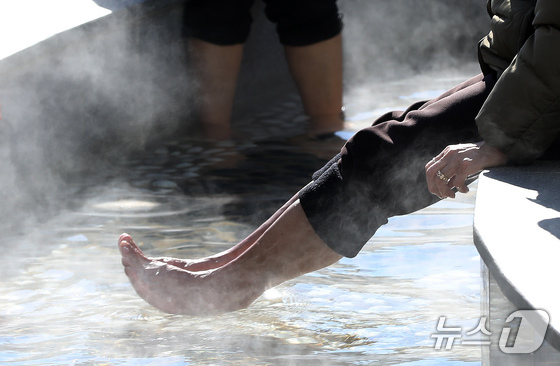 전국적으로 추위가 기승을 부린 3일 부산 해운대해수욕장 온천족욕탕을 찾은 시민들이 따뜻한 온천물에 발을 담그고 추위를 녹이고 있다. 2025.12.3/뉴스1 …