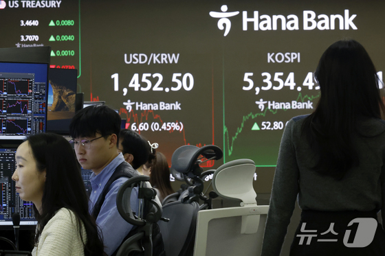 11일 오후 서울 중구 하나은행 본점 딜링룸 전광판에 증시 종가가 표시되고 있다. 이날 코스피는 전 거래일 대비 52.80포인트1.00% 오른 5354…