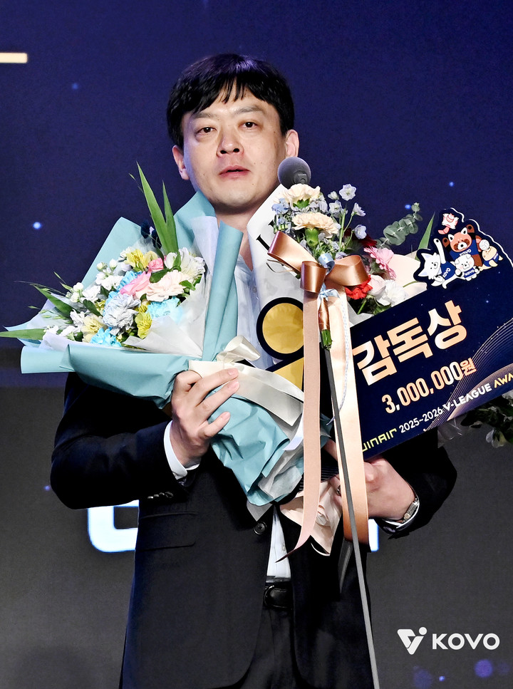 여자부 사상 첫 준PO→챔프전 직행 우승...첫 감독상 받은 이영택 감독 "매일 시상식에서 밥만 먹고 갔는데..." [V-시상식]