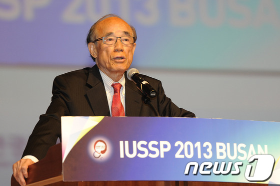 고인이 된 박은태 전 인구문제연구소 이사장이 2013년 8월 부산에서 열린 '제27차 국제인구과학연맹IUSSP 세계인구총회'에서 인사말을 하고 있다. …