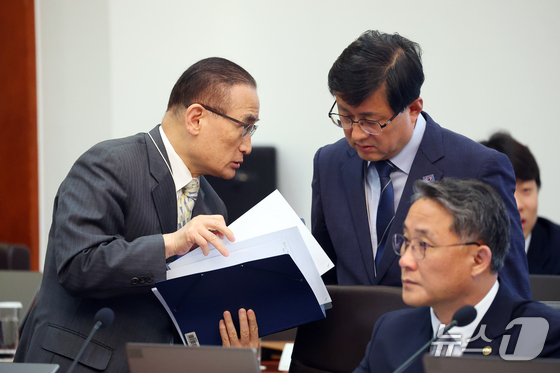 김성환 기후에너지환경부 장관오른쪽과 위성락 국가안보실장이 28일 청와대에서 열린 제18회 국무회의 겸 제6차 비상경제점검회의에서대화를 하고 있다. 20…