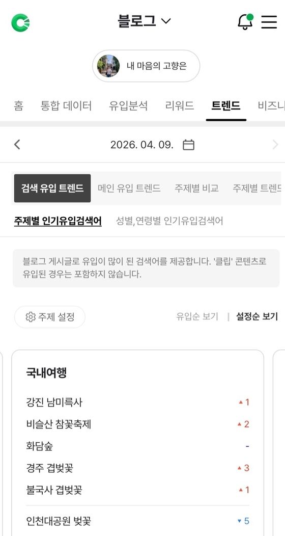 네이버 블로그의 실시간 인기 유입 검색어를 확인할 수 있는 '트렌드 키워드' 중 '국내여행' 부문 상위권에 봄철 명소 관련 키워드가 올라있다. 2026.04.10. …