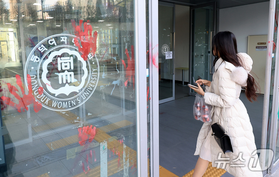 서울 성북구 동덕여자대학교에 공학 전환 반대 관련 래커칠이 남아있는 모습. 2025.12.4/뉴스1 News1 이호윤 기자김명애 동덕여대 총장의 교비…