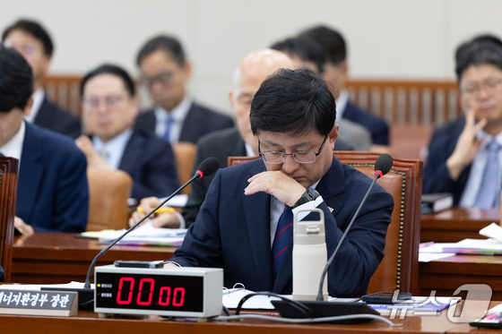 김성환 기후에너지환경부 장관이 일 서울 여의도 국회에서 열린 기후에너지환경노동위원회 기후에너지환경부 등에 대한 국정감사에 출석해 생각에 잠겨있다. ..…
