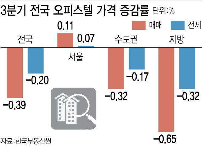 [이데일리 이다원 기자] 올해 3분기 전국 오피스텔 매매가격과 전셋값이 모두 하락세를 이어간 가운데, 월세는 상승폭을 다시 키운 것으로 나타났다. 특히 서울은 아파트 매매가격 상승